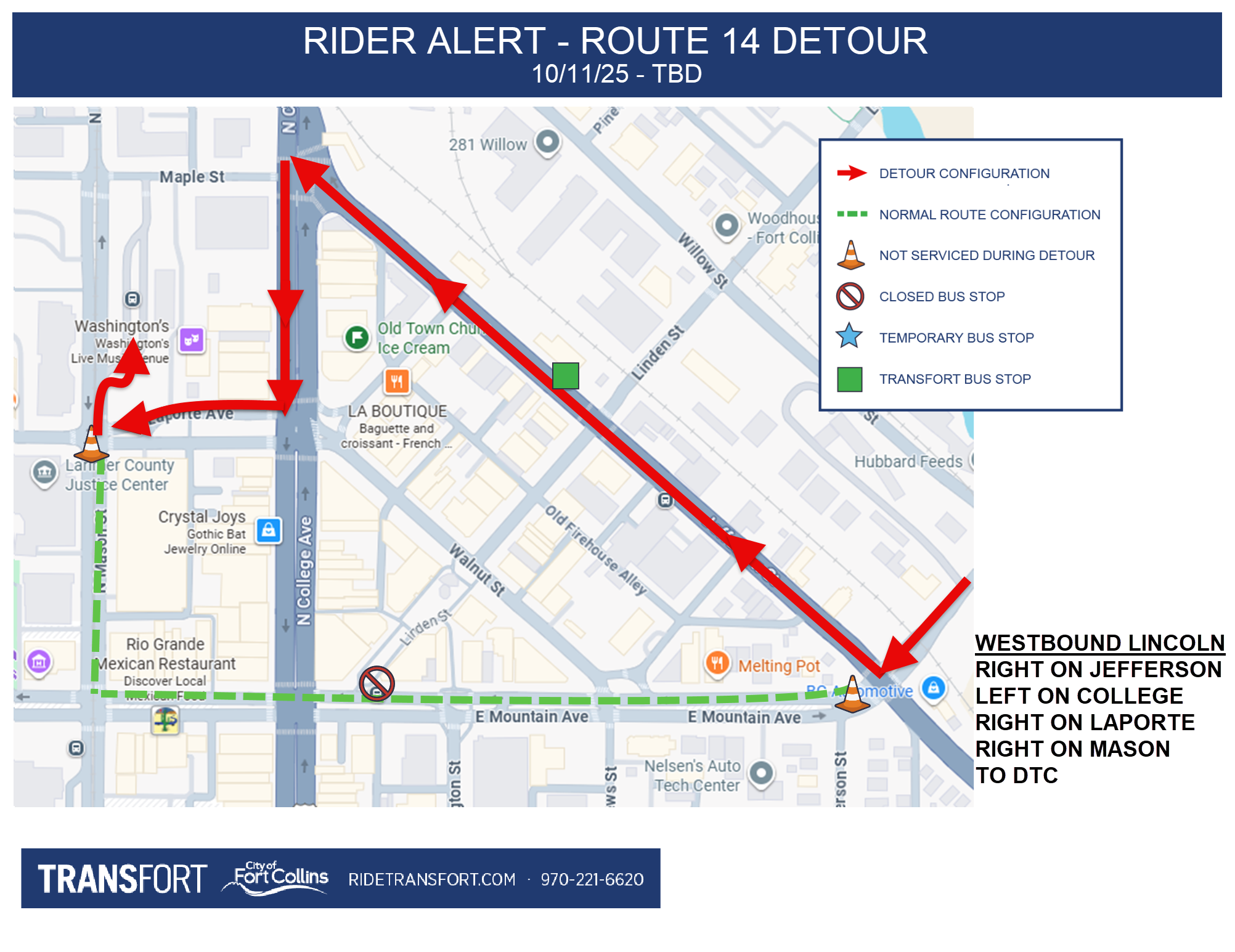Detour (Effective: 10/11/2025 – TBD) Route 14 detour 10/11/25 – TBD stops affected. Info: ridetransfort.com |