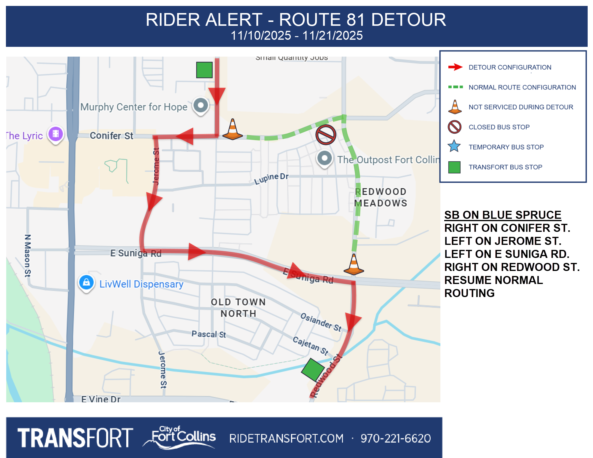 Detour (Effective: 11/13/2025 – TBD) Rt. 8 & 81 detour 11/14/25 stops affected. Info: ridetransfort.com |