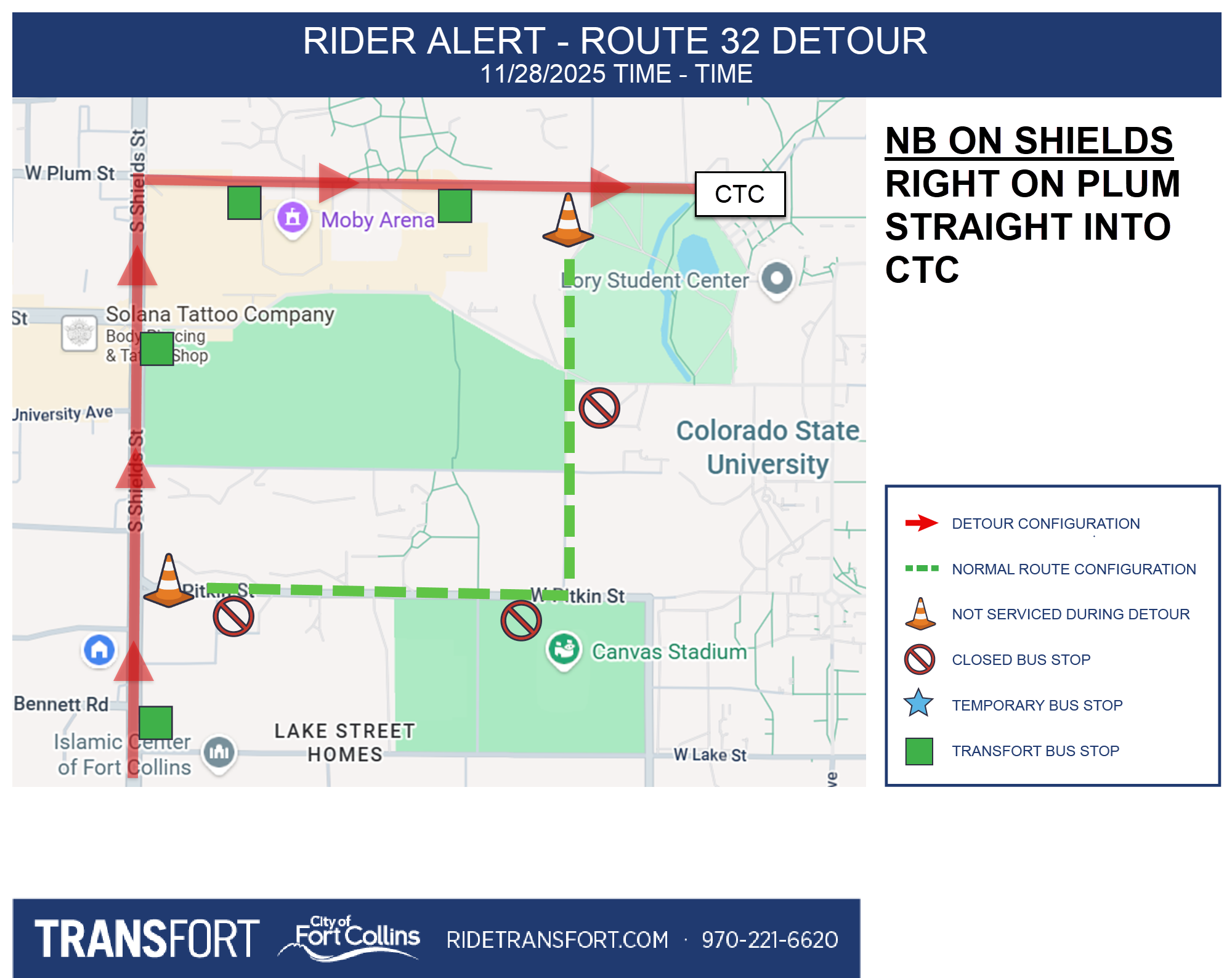 Route 32 connects riders to the CSU Transit Center (CTC), Elizabeth, Overland, and Prospect. Plus, with connections to other Transfort routes, it’s easy to travel to other parts of the city.